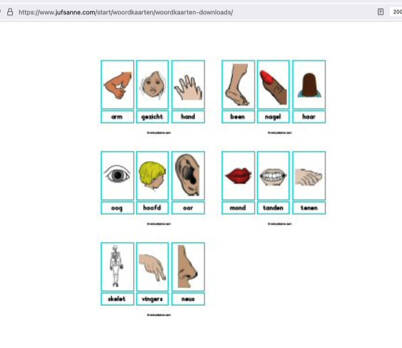 Hierbij twee screenshots van de woordkaarten rond het lichaam op de website van juf Sanne: